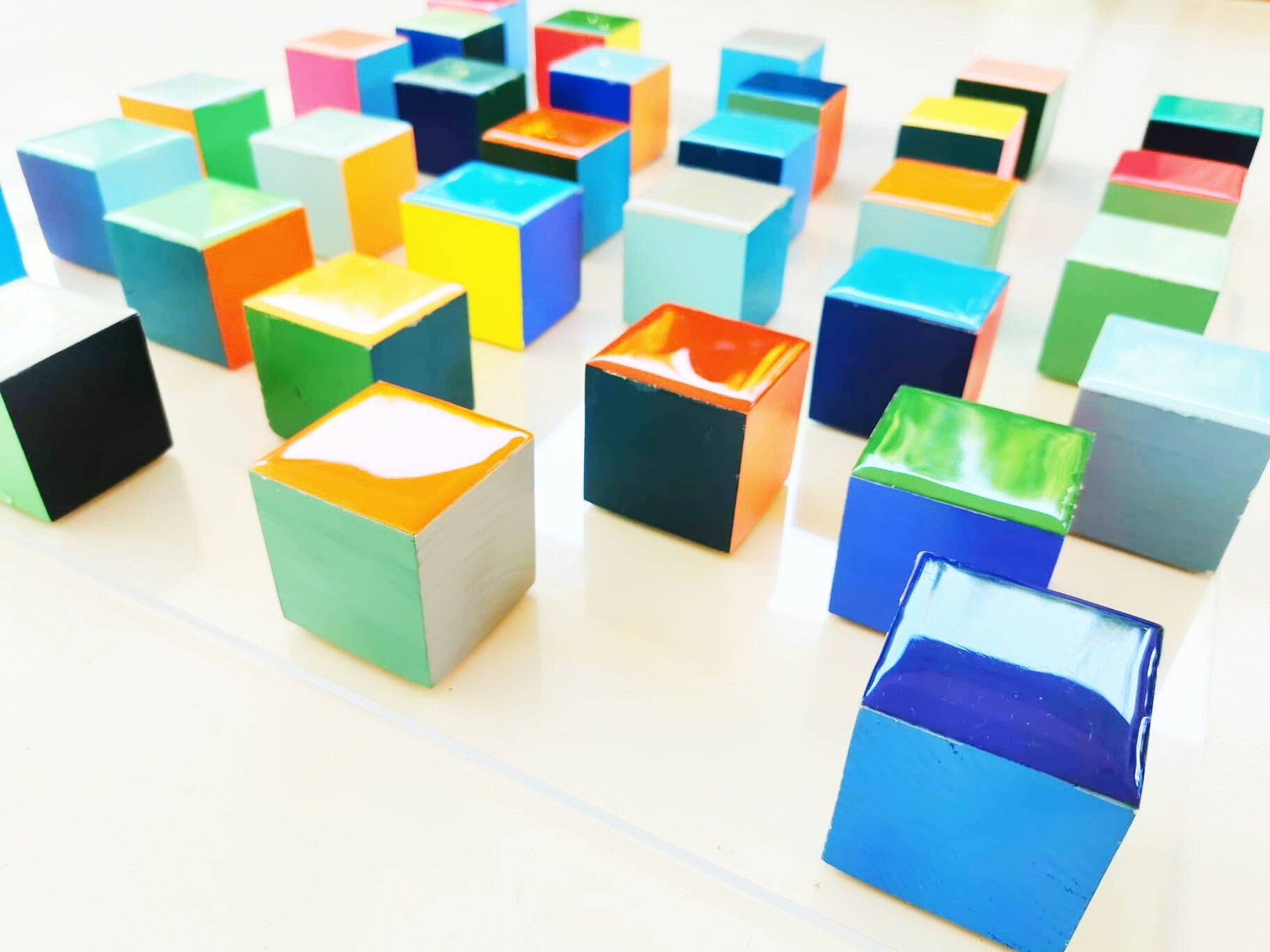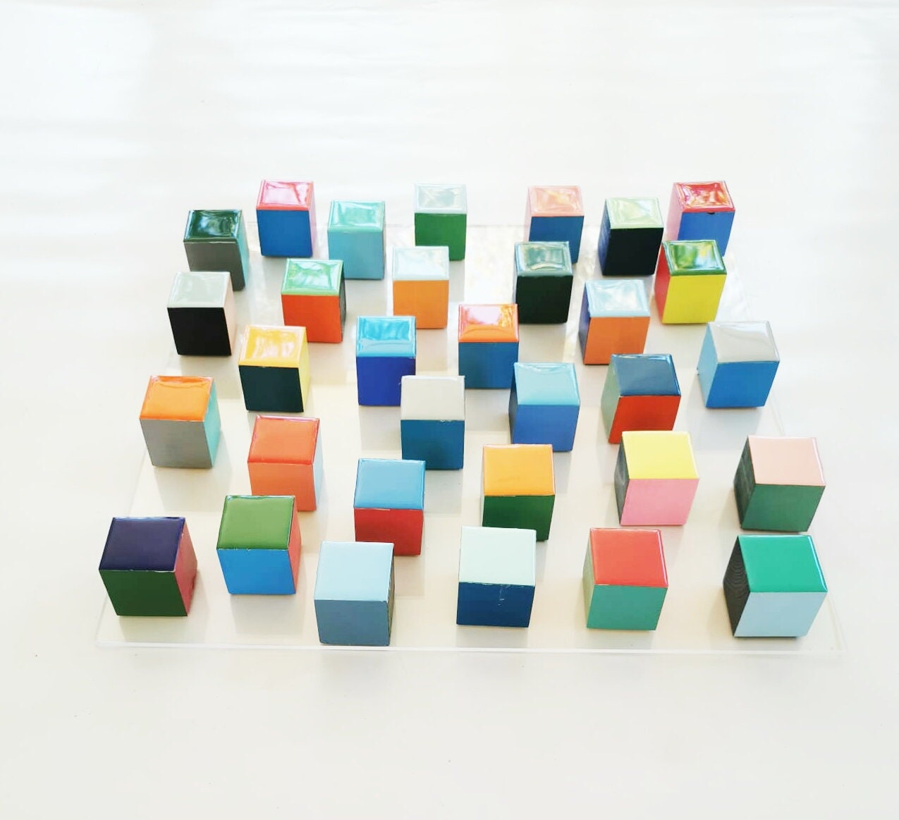 Original and unique work in wood with resin finish. Each cube is a unique little work of art. Hand cut and painted with random color on a grid layout